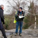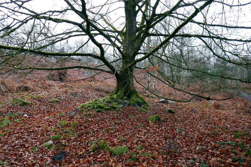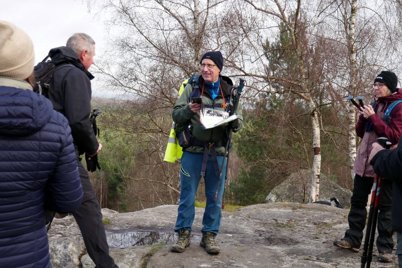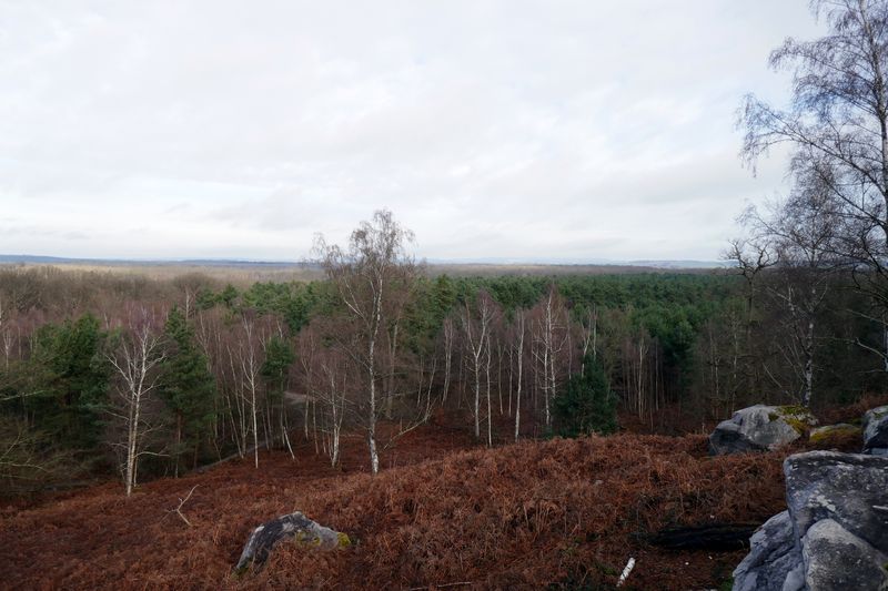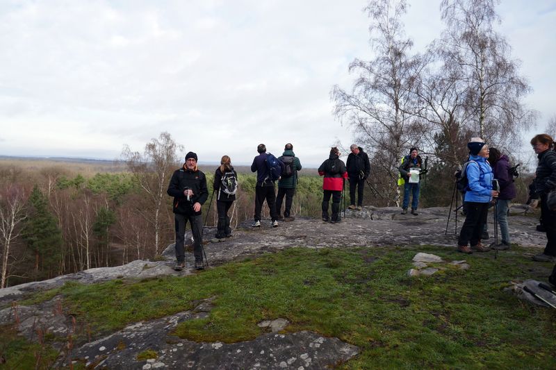 Pour atteindre notre premier arrêt à la pierre sorcière / sourcière, pierre druidique, les premiers dénivelés nous ont vite réchauffés. Depuis ce promontoire, nous avons une vue sur tout le massif de la forêt.