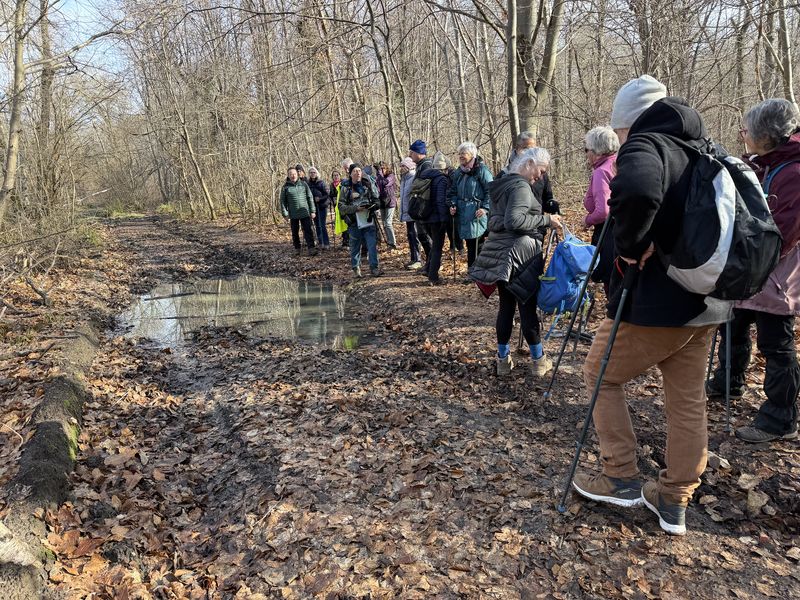 Nous commençons cette randonnée par une montée dans le « Bois du parc » en suivant le GR 11 A – GR 15. Cette partie du parcours était très boueuse et semée d’embuches à cause des nombreux arbres tombés sur le chemin. Notre animateur Benjamin à du raccourcir un peu le parcours pour un retour aux voitures prévu vers 13h00.