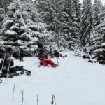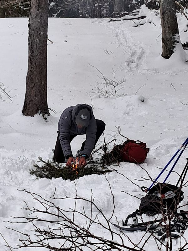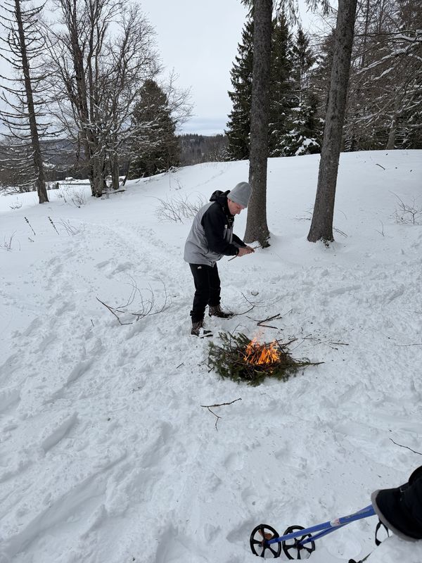 Durant le pique-nique, notre accompagnateur montagne Damien nous a fait le plaisir de nous réchauffer avec un feu allumé à partir de résine d’épicéa et de brindilles tombées au sol. Après une chouette balade, cette journée s’est terminée sous une averse avant l’arrivée.