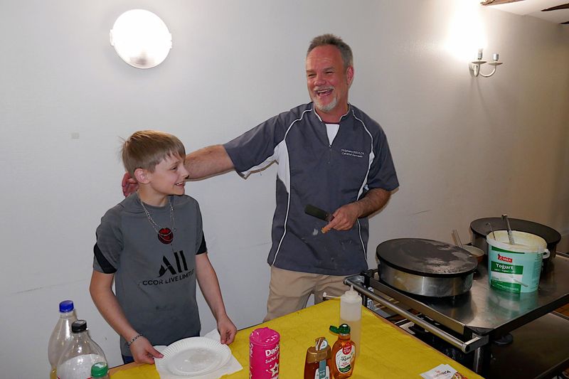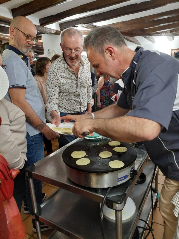 Pour finir, notre « chef crêpes » à installé deux crêpières pour nous faire déguster des crêpes mille trous, agrémentées d’amandes effilées et grillées, miel, sirop d’érable, sucre glace etc… Très très bonnes ces crêpes à voir la file d’attente devant la table. Et certains reviennent plusieurs fois.
